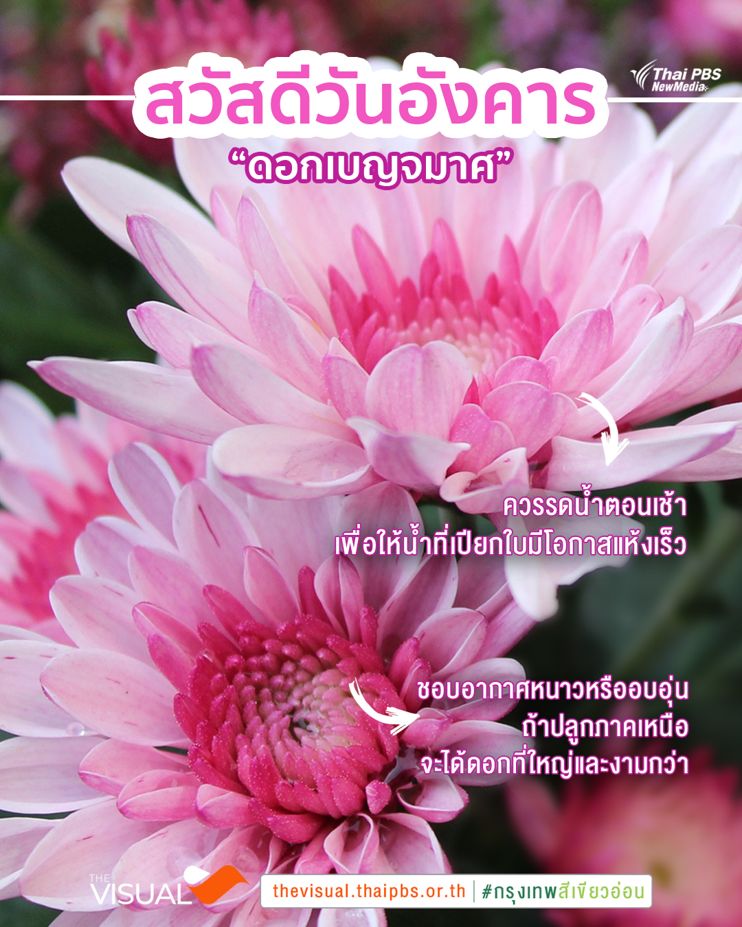 ดอกเบญจมาศ ควรรดนํ้าตอนเช้า เพื่อให้นํ้าที่เปียกใบมีโอกาสแห้งได้ภายในเวลาอันรวดเร็ว