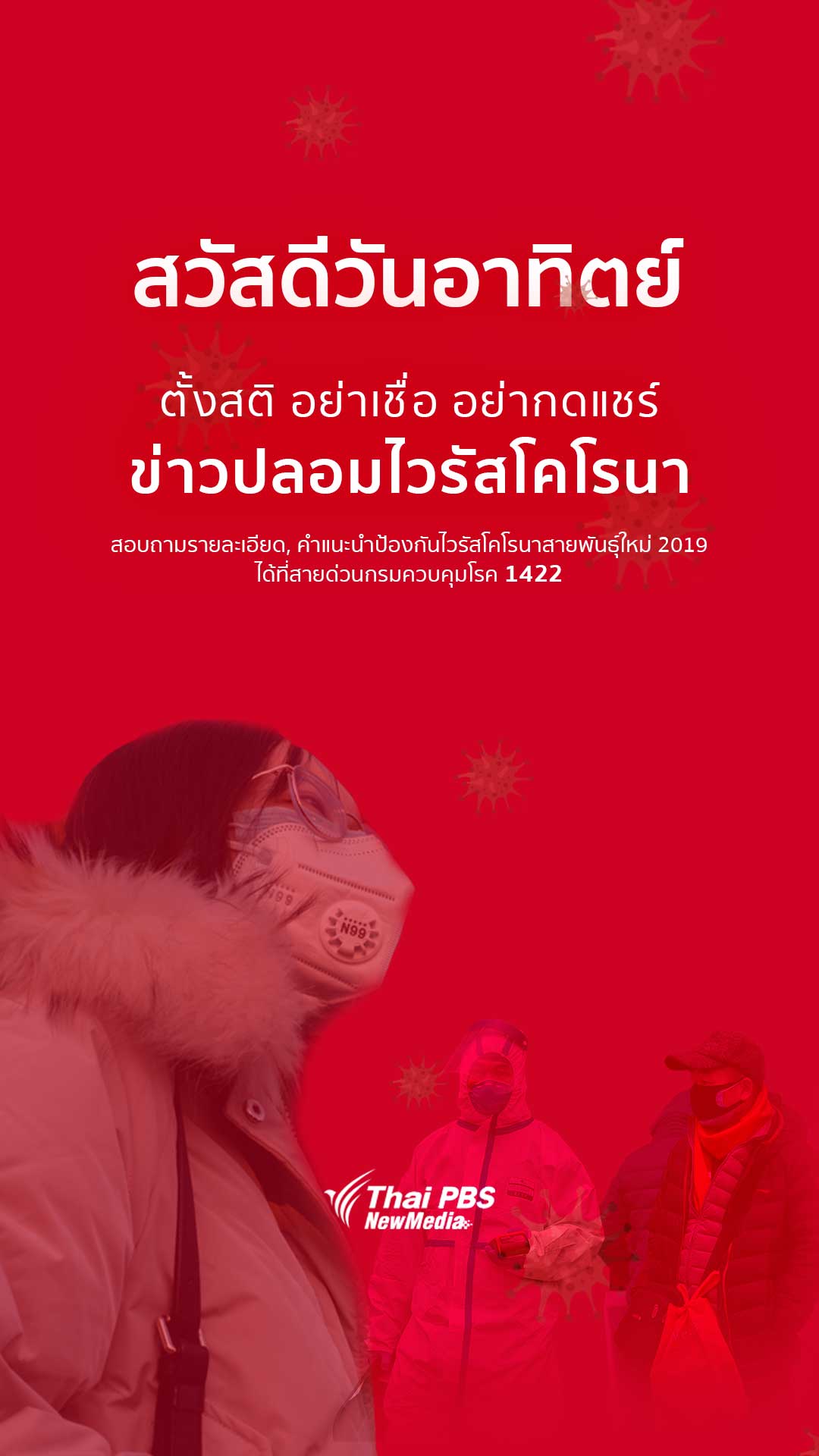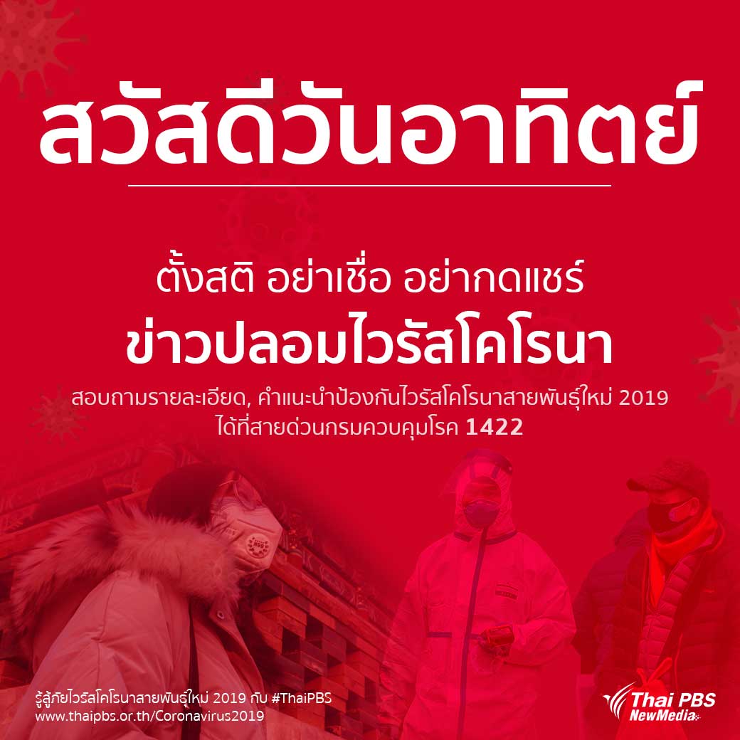 ตั้งสติ อย่าเชื่อ อย่าแชร์ข่าวปลอม COVID-19 หากมีข้อสงสัยสอบถามเพิ่มเติมได้ที่สายด่วนกรมควบคุมโรค 1422